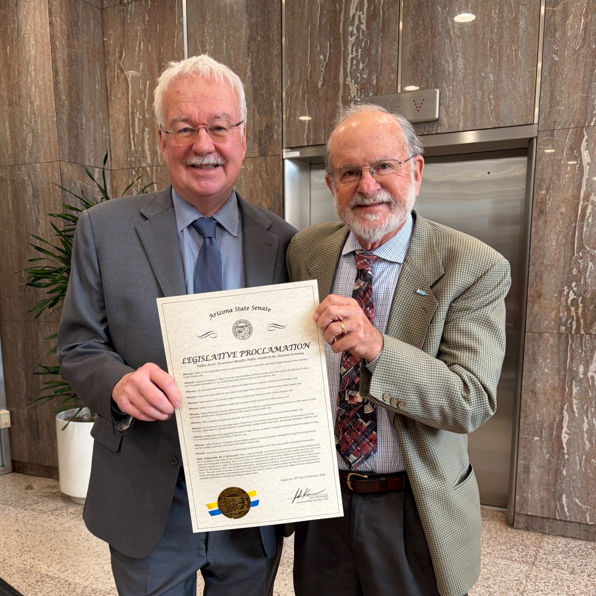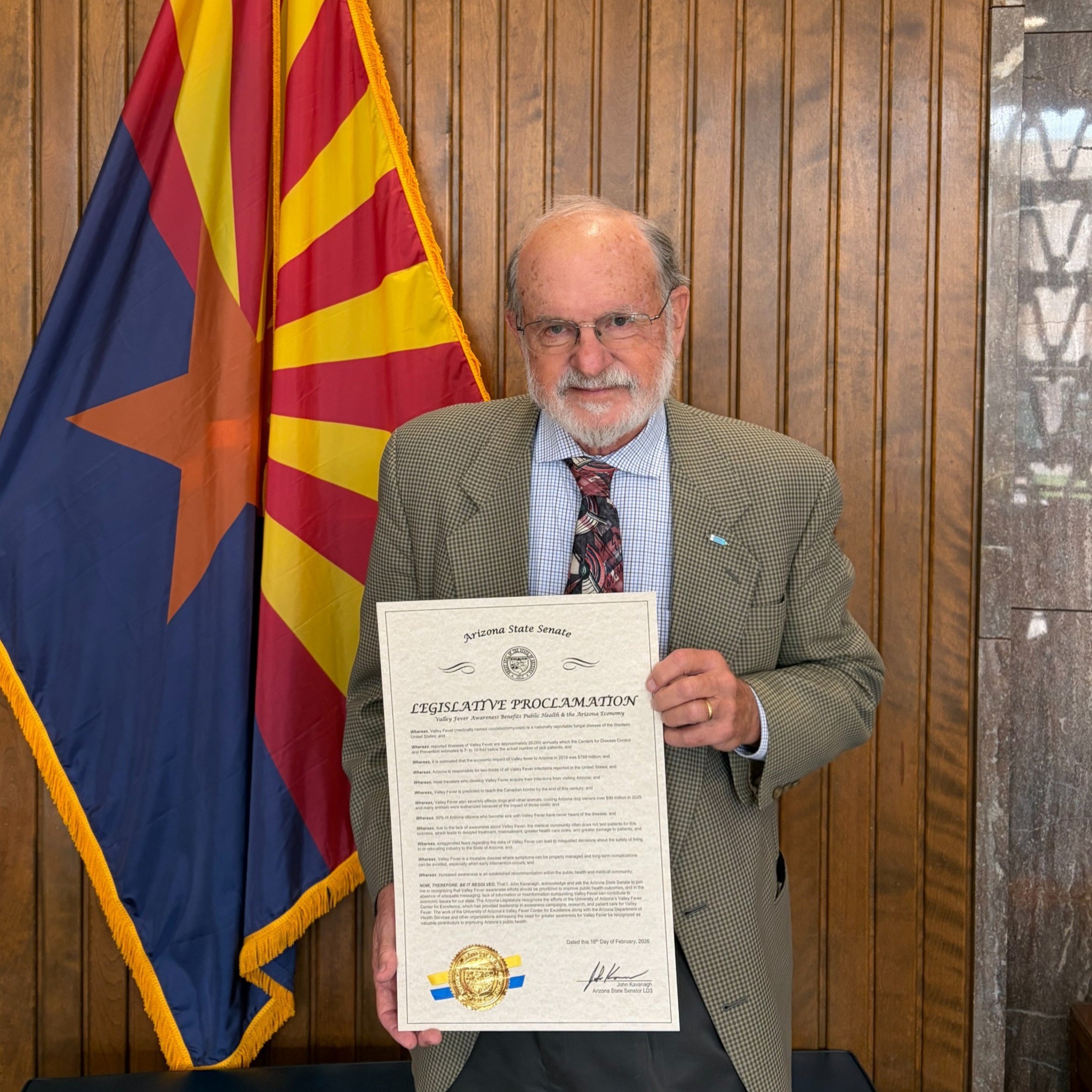 - That the work of the University of Arizona’s Valley Fever Center for Excellence along with the Arizona Department of Health Services and other organizations addressing the need for greater awareness for Valley fever be recognized as valuable contributors to improving Arizona’s public health.