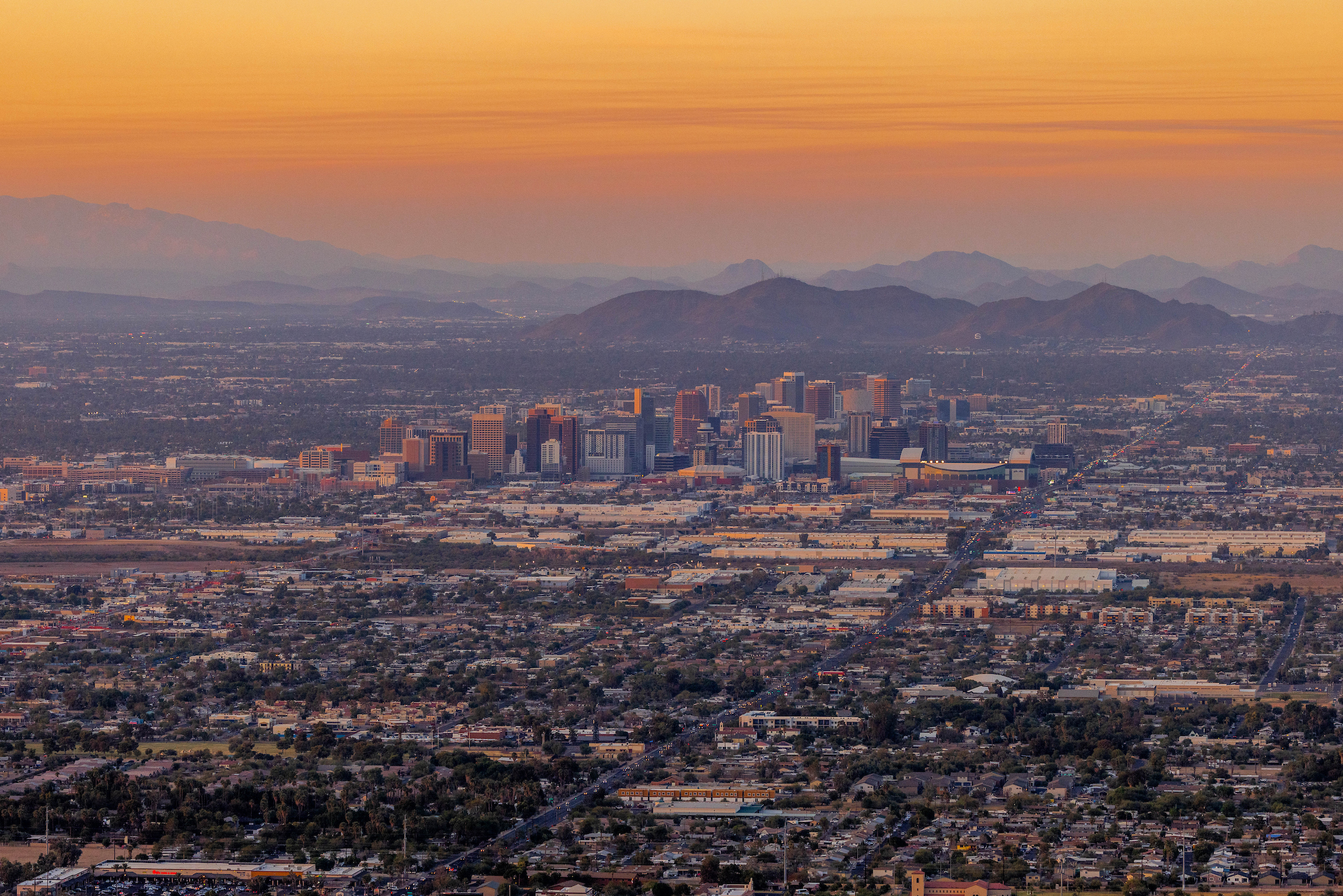 A view of downtown Phoenix as the sun sets as seen from Dobbins Lookout at South Mountain in Phoenix on Nov. 1, 2023. (Photo by Samantha Chow/Arizona State University)