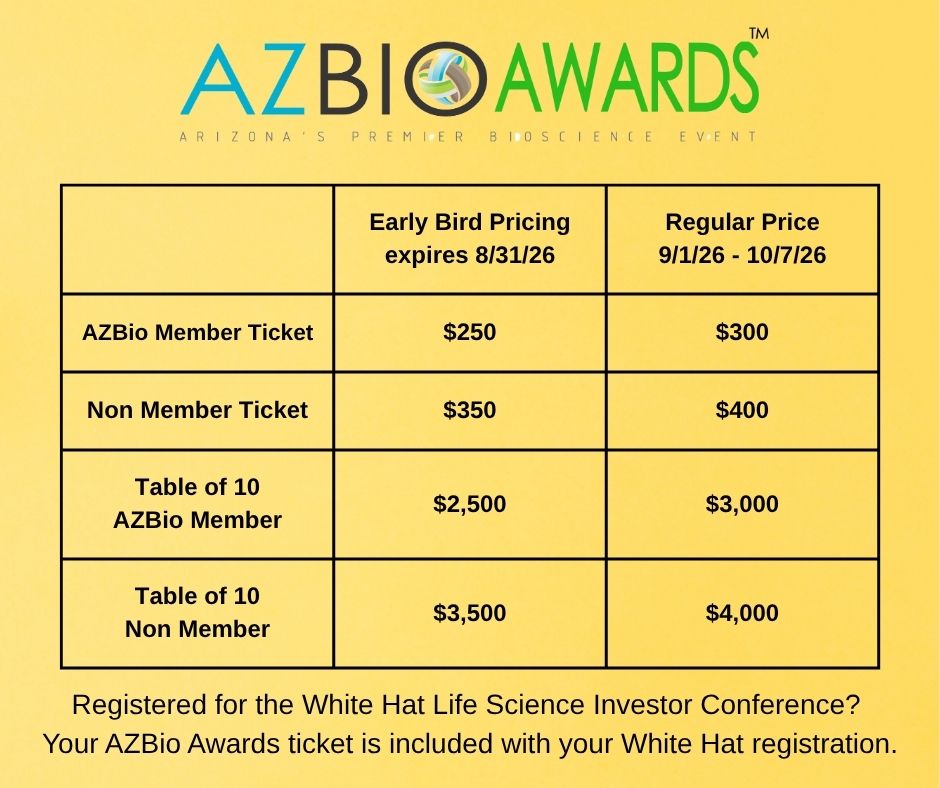 AZBio Awards tickets are not refundable. Guest substitutions will be accommodated. Contact Abigail@AZBio.org to update your registration.