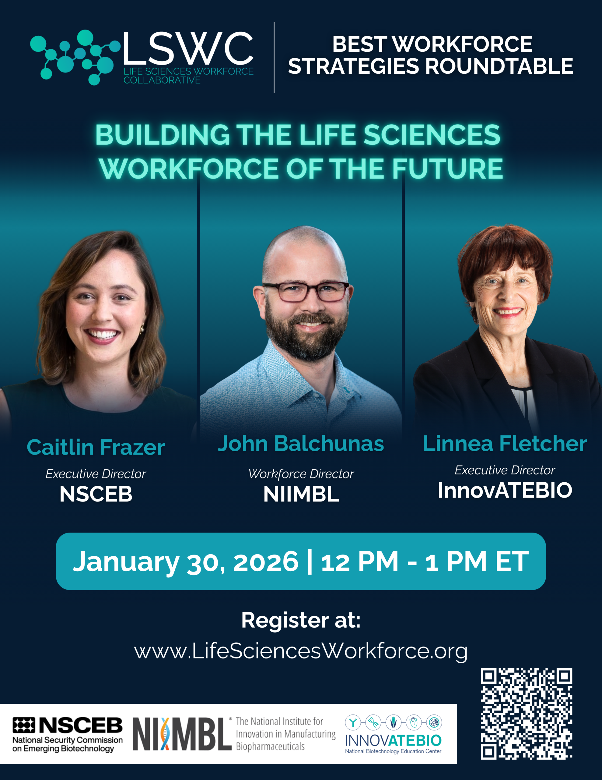 The LSWC is excited to launch its first LSWC Best Workforce Strategies Roundtable on January 30 with opening remarks from Caitlin Frazer, Executive Director of the National Security Commission on Emerging Biotechnology (NSCEB). Caitlin will share an overview of the Commission’s workforce recommendations, recent policy developments, and insights from NSCEB’s national roadshows. We’ll then hear from NIIMBL and InnovATEBIO, two organizations highlighted in the NSCEB report, who will share strategies and lessons shaping the future biomanufacturing workforce.